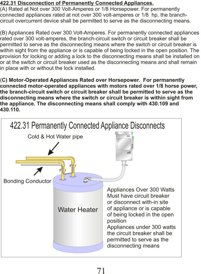 Water heater disconnecting means. The disconnecting means for a permanently connected water heater must comply with 42231b. Direct fired electric steam and hot water control transformer and disconnecting means are optional. The switch must be rated for the voltage of the water heater 120 240 etc and the amperage drawn by the water heater 2008 nec 40414..